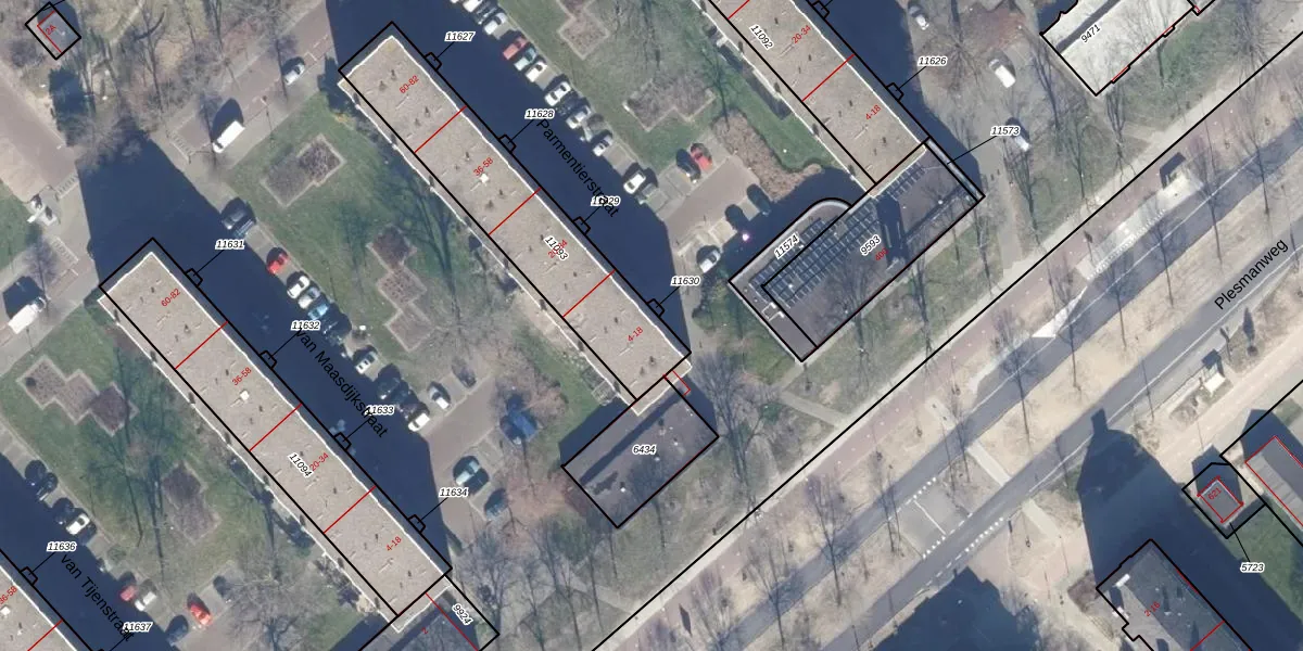 Het perceel waarop Parmentierstraat 6 staat heeft een oppervlakte van 758 m². Dit is een groot perceel. De perceeloppervlakte wordt geregistreerd door het Kadaster. Gedetailleerde informatie over de maten van dit perceel kunt u vinden in het rapport Kadastrale kaart met maatvoering van Parmentierstraat 6.