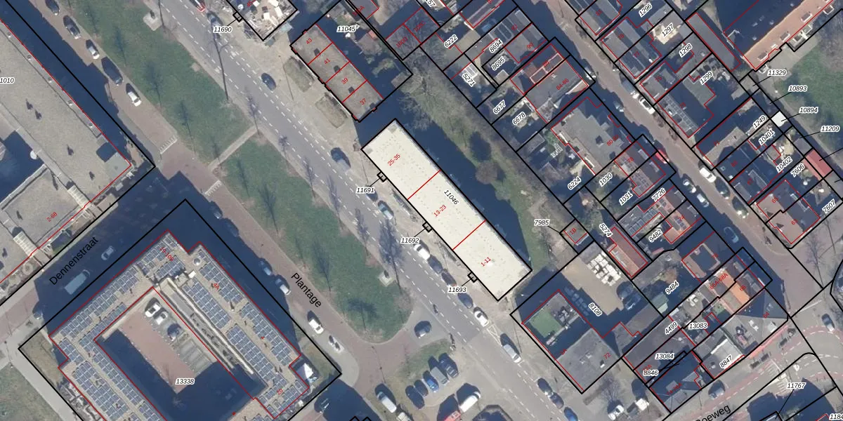 Het perceel waarop Plantage 13 staat heeft een oppervlakte van 541 m². Dit is een groot perceel. De perceeloppervlakte wordt geregistreerd door het Kadaster. Gedetailleerde informatie over de maten van dit perceel kunt u vinden in het rapport Kadastrale kaart met maatvoering van Plantage 13.
