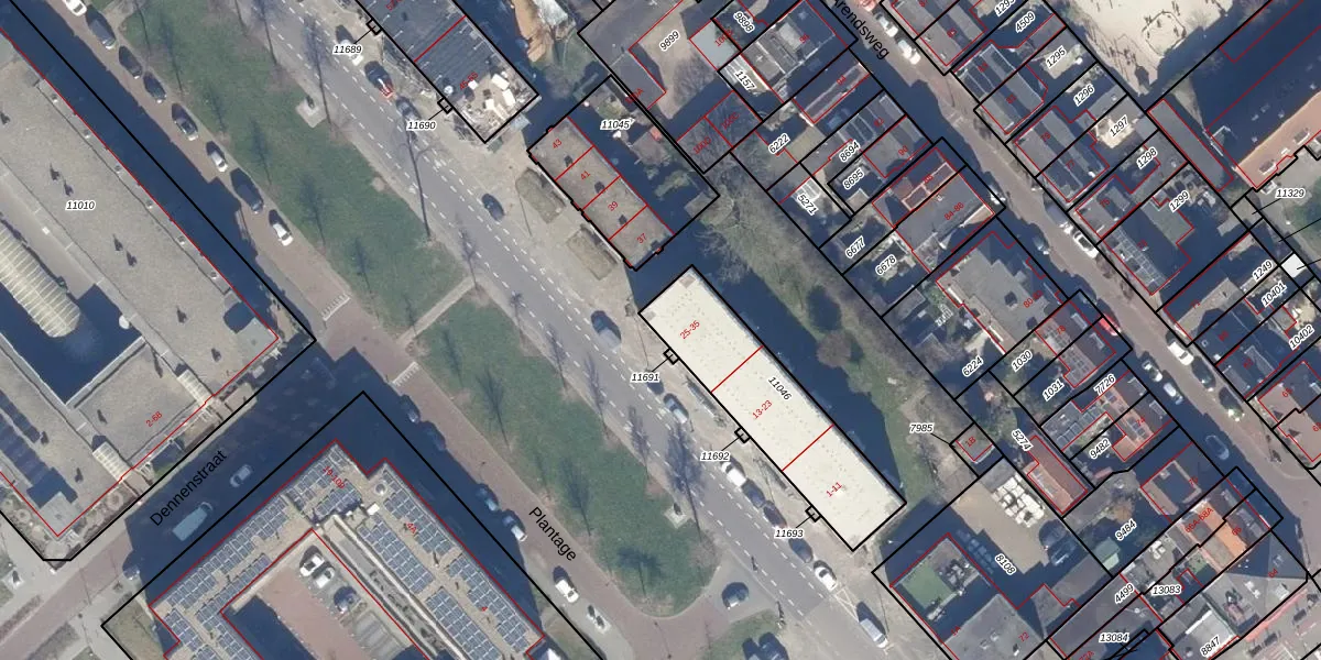 Het perceel waarop Plantage 25 staat heeft een oppervlakte van 541 m². Dit is een groot perceel. De perceeloppervlakte wordt geregistreerd door het Kadaster. Gedetailleerde informatie over de maten van dit perceel kunt u vinden in het rapport Kadastrale kaart met maatvoering van Plantage 25.
