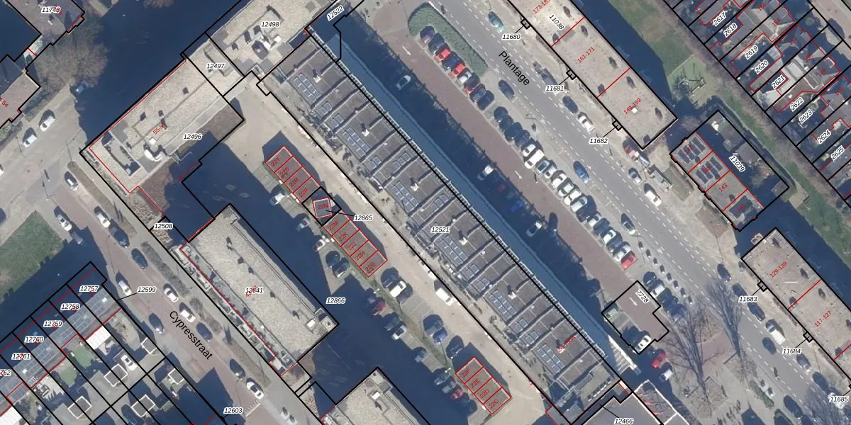 Het perceel waarop Plantage 82 staat heeft een oppervlakte van 1749 m². Dit is een zeer groot perceel. De perceeloppervlakte wordt geregistreerd door het Kadaster. Gedetailleerde informatie over de maten van dit perceel kunt u vinden in het rapport Kadastrale kaart met maatvoering van Plantage 82.