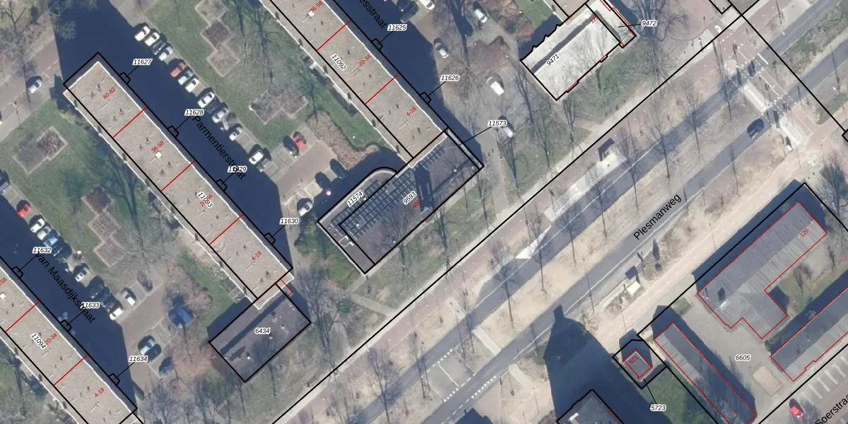 Het perceel waarop Plesmanweg 400 staat heeft een oppervlakte van 425 m². Dit is een groot perceel. De perceeloppervlakte wordt geregistreerd door het Kadaster. Gedetailleerde informatie over de maten van dit perceel kunt u vinden in het rapport Kadastrale kaart met maatvoering van Plesmanweg 400.