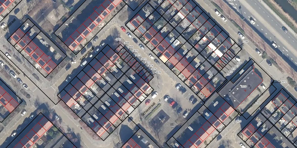Het perceel waarop Schiestraat 33 staat heeft een oppervlakte van 18 m². Dit is een klein perceel. De perceeloppervlakte wordt geregistreerd door het Kadaster. Gedetailleerde informatie over de maten van dit perceel kunt u vinden in het rapport Kadastrale kaart met maatvoering van Schiestraat 33.