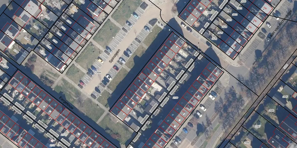 Het perceel waarop Spinsteen 16 staat heeft een oppervlakte van 1640 m². Dit is een zeer groot perceel. De perceeloppervlakte wordt geregistreerd door het Kadaster. Gedetailleerde informatie over de maten van dit perceel kunt u vinden in het rapport Kadastrale kaart met maatvoering van Spinsteen 16.