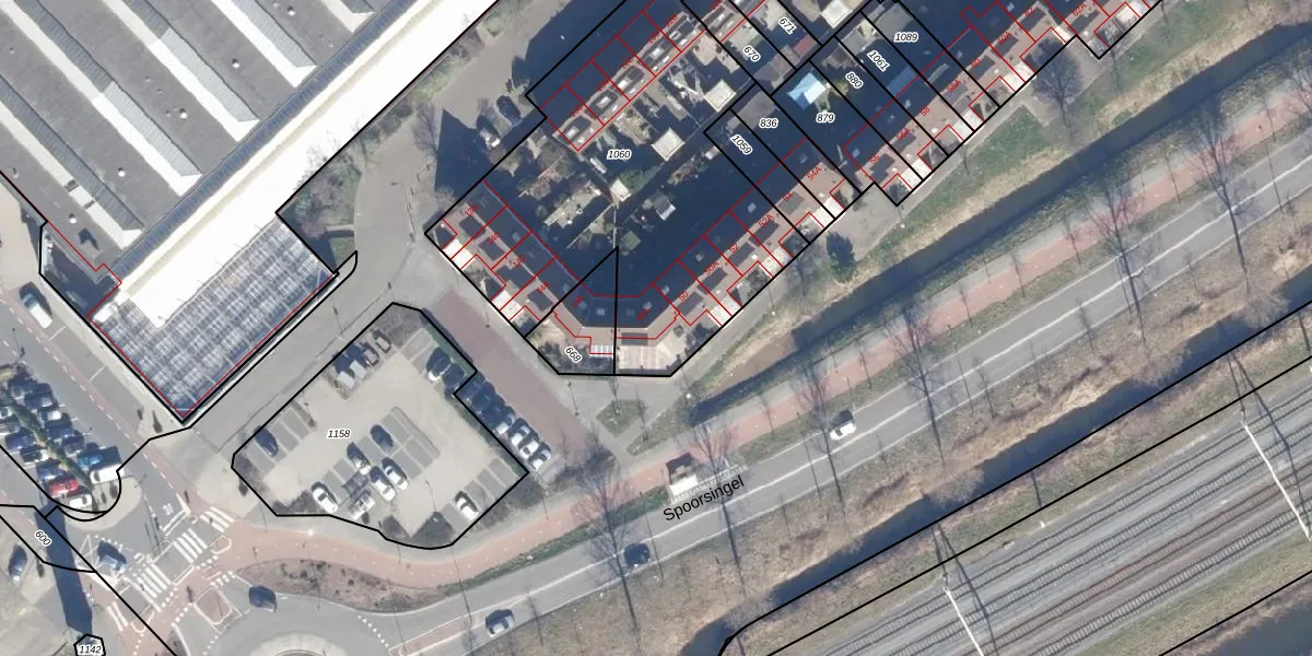 Het perceel waarop Spoorsingel 48-A staat heeft een oppervlakte van 1824 m². Dit is een zeer groot perceel. De perceeloppervlakte wordt geregistreerd door het Kadaster. Gedetailleerde informatie over de maten van dit perceel kunt u vinden in het rapport Kadastrale kaart met maatvoering van Spoorsingel 48-A.