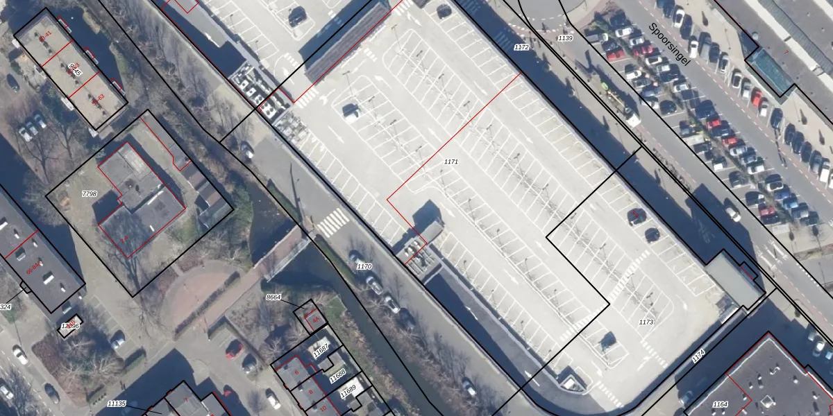 Het perceel waarop Spoorsingel 9 staat heeft een oppervlakte van 4410 m². Dit is een zeer groot perceel. De perceeloppervlakte wordt geregistreerd door het Kadaster. Gedetailleerde informatie over de maten van dit perceel kunt u vinden in het rapport Kadastrale kaart met maatvoering van Spoorsingel 9.