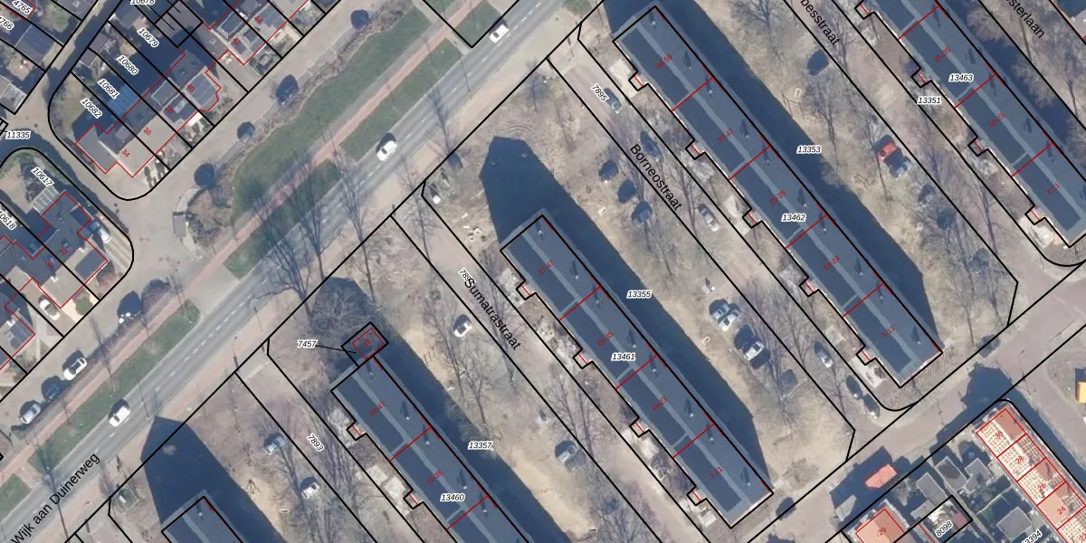 Sumatrastraat 45 is gelegen op kadastraal perceel WIJ02B13461. Deze kadastrale aanduiding is uniek en wordt gebruikt door het Kadaster om eigendomsrechten en andere zakelijke rechten vast te leggen. Het perceel maakt onderdeel uit van de kadastrale gemeente Wijk aan Zee en Duin.