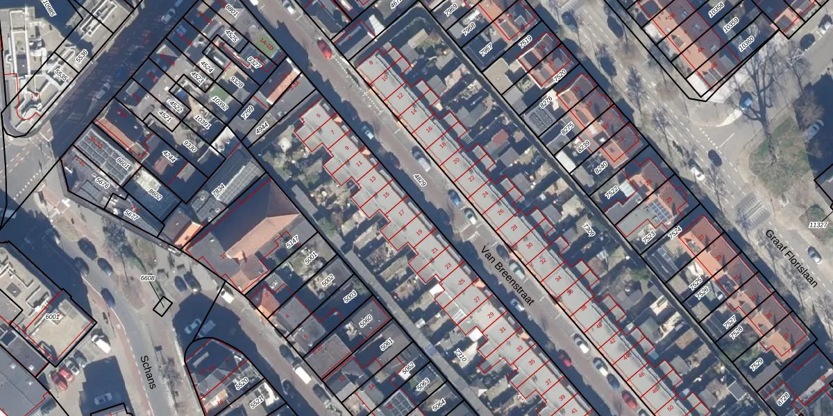Het perceel waarop Van Breenstraat 17 staat heeft een oppervlakte van 2960 m². Dit is een zeer groot perceel. De perceeloppervlakte wordt geregistreerd door het Kadaster. Gedetailleerde informatie over de maten van dit perceel kunt u vinden in het rapport Kadastrale kaart met maatvoering van Van Breenstraat 17.