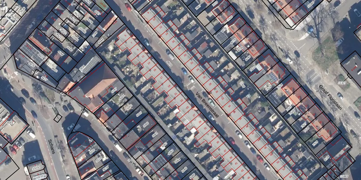 Het perceel waarop Van Breenstraat 21 staat heeft een oppervlakte van 2960 m². Dit is een zeer groot perceel. De perceeloppervlakte wordt geregistreerd door het Kadaster. Gedetailleerde informatie over de maten van dit perceel kunt u vinden in het rapport Kadastrale kaart met maatvoering van Van Breenstraat 21.