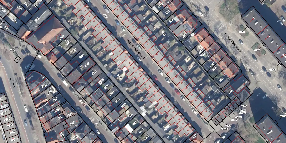 Het perceel waarop Van Breenstraat 33 staat heeft een oppervlakte van 2960 m². Dit is een zeer groot perceel. De perceeloppervlakte wordt geregistreerd door het Kadaster. Gedetailleerde informatie over de maten van dit perceel kunt u vinden in het rapport Kadastrale kaart met maatvoering van Van Breenstraat 33.