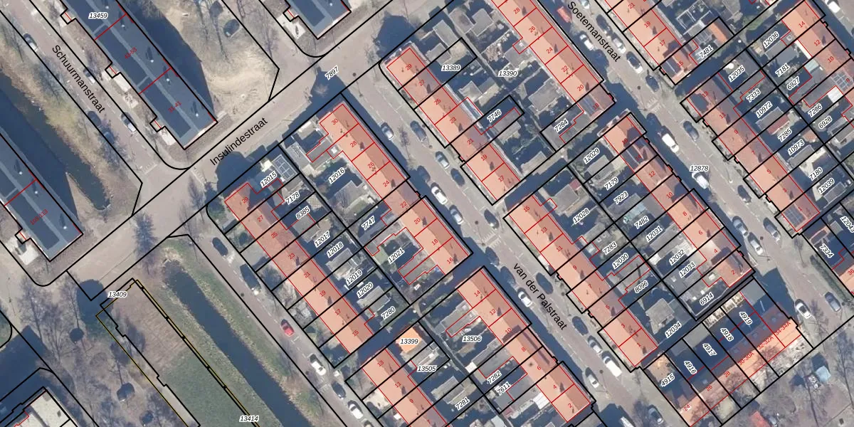 Het perceel waarop van der Palstraat 20 staat heeft een oppervlakte van 334 m². Dit is een groot perceel. De perceeloppervlakte wordt geregistreerd door het Kadaster. Gedetailleerde informatie over de maten van dit perceel kunt u vinden in het rapport Kadastrale kaart met maatvoering van van der Palstraat 20.