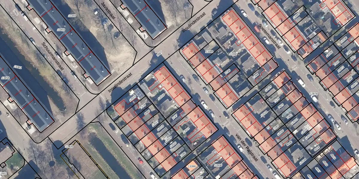 Het perceel waarop van der Palstraat 26 staat heeft een oppervlakte van 485 m². Dit is een groot perceel. De perceeloppervlakte wordt geregistreerd door het Kadaster. Gedetailleerde informatie over de maten van dit perceel kunt u vinden in het rapport Kadastrale kaart met maatvoering van van der Palstraat 26.
