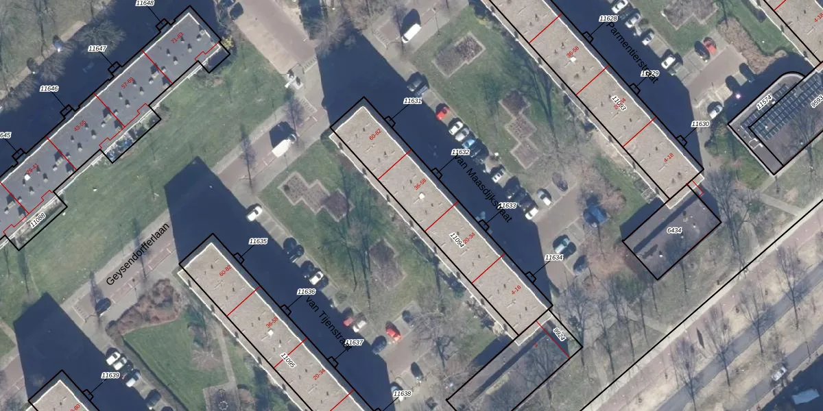 Het perceel waarop van Maasdijkstraat 56 staat heeft een oppervlakte van 758 m². Dit is een groot perceel. De perceeloppervlakte wordt geregistreerd door het Kadaster. Gedetailleerde informatie over de maten van dit perceel kunt u vinden in het rapport Kadastrale kaart met maatvoering van van Maasdijkstraat 56.