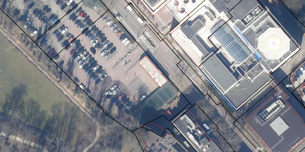 Het perceel waarop Vondellaan 10 staat heeft een oppervlakte van 3642 m². Dit is een zeer groot perceel. De perceeloppervlakte wordt geregistreerd door het Kadaster. Gedetailleerde informatie over de maten van dit perceel kunt u vinden in het rapport Kadastrale kaart met maatvoering van Vondellaan 10.