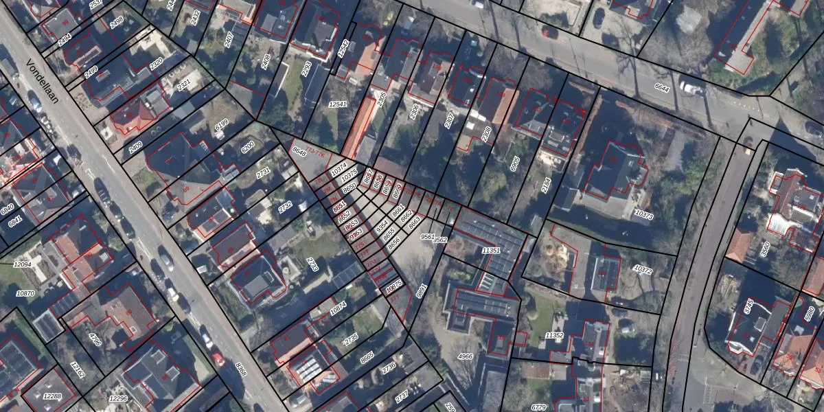 Het perceel waarop Vondellaan 77-C staat heeft een oppervlakte van 28 m². Dit is een klein perceel. De perceeloppervlakte wordt geregistreerd door het Kadaster. Gedetailleerde informatie over de maten van dit perceel kunt u vinden in het rapport Kadastrale kaart met maatvoering van Vondellaan 77-C.