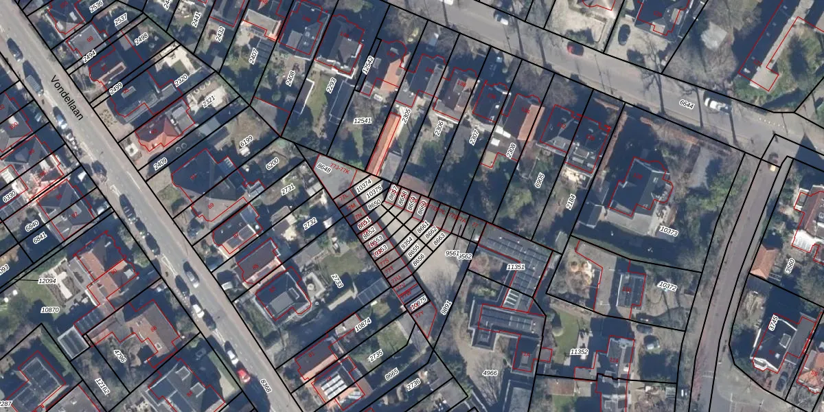 Het perceel waarop Vondellaan 77-F staat heeft een oppervlakte van 22 m². Dit is een klein perceel. De perceeloppervlakte wordt geregistreerd door het Kadaster. Gedetailleerde informatie over de maten van dit perceel kunt u vinden in het rapport Kadastrale kaart met maatvoering van Vondellaan 77-F.