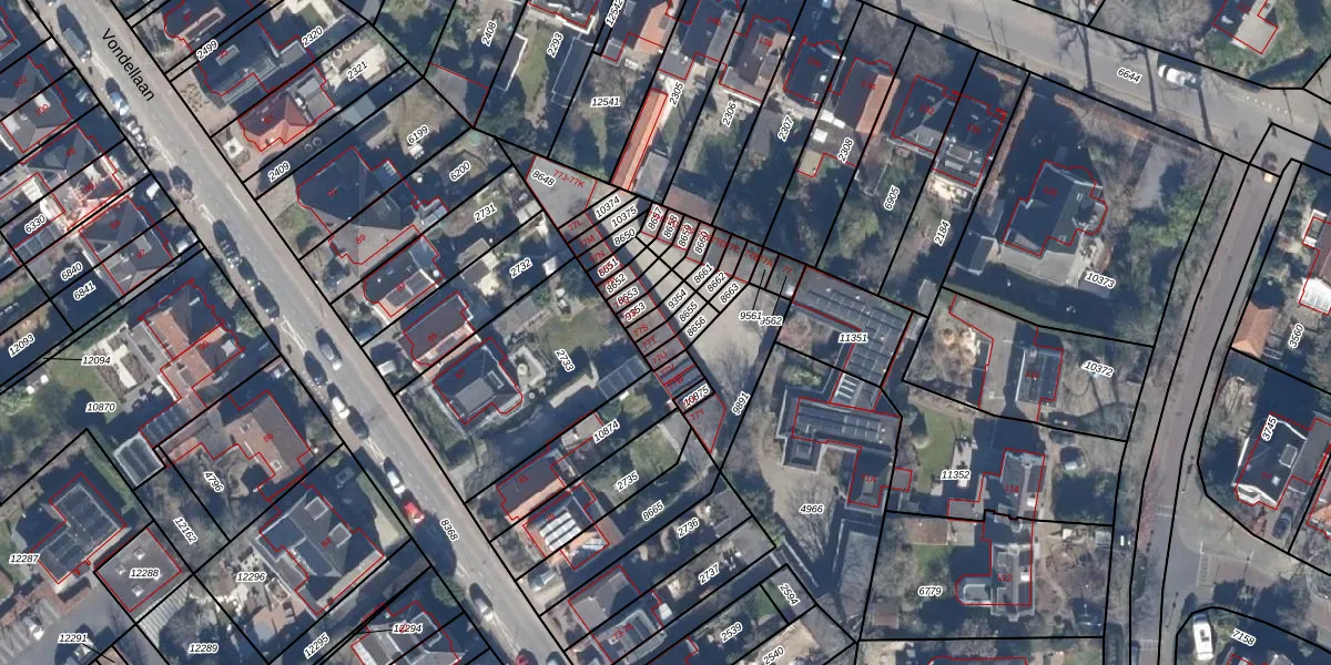 Het perceel waarop Vondellaan 77-T staat heeft een oppervlakte van 30 m². Dit is een klein perceel. De perceeloppervlakte wordt geregistreerd door het Kadaster. Gedetailleerde informatie over de maten van dit perceel kunt u vinden in het rapport Kadastrale kaart met maatvoering van Vondellaan 77-T.