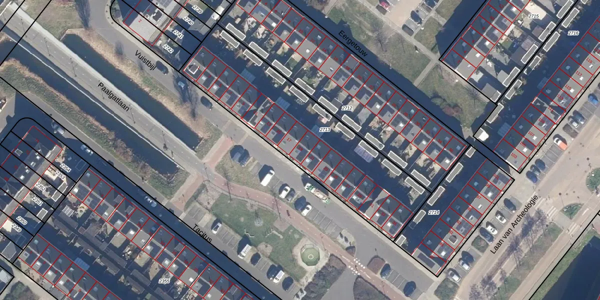 Het perceel waarop Vuistbijl 19 staat heeft een oppervlakte van 1900 m². Dit is een zeer groot perceel. De perceeloppervlakte wordt geregistreerd door het Kadaster. Gedetailleerde informatie over de maten van dit perceel kunt u vinden in het rapport Kadastrale kaart met maatvoering van Vuistbijl 19.