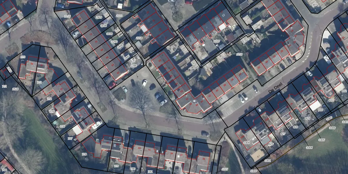 Het perceel waarop De Deel 54 staat heeft een oppervlakte van 3079 m². Dit is een zeer groot perceel. De perceeloppervlakte wordt geregistreerd door het Kadaster. Gedetailleerde informatie over de maten van dit perceel kunt u vinden in het rapport Kadastrale kaart met maatvoering van De Deel 54.