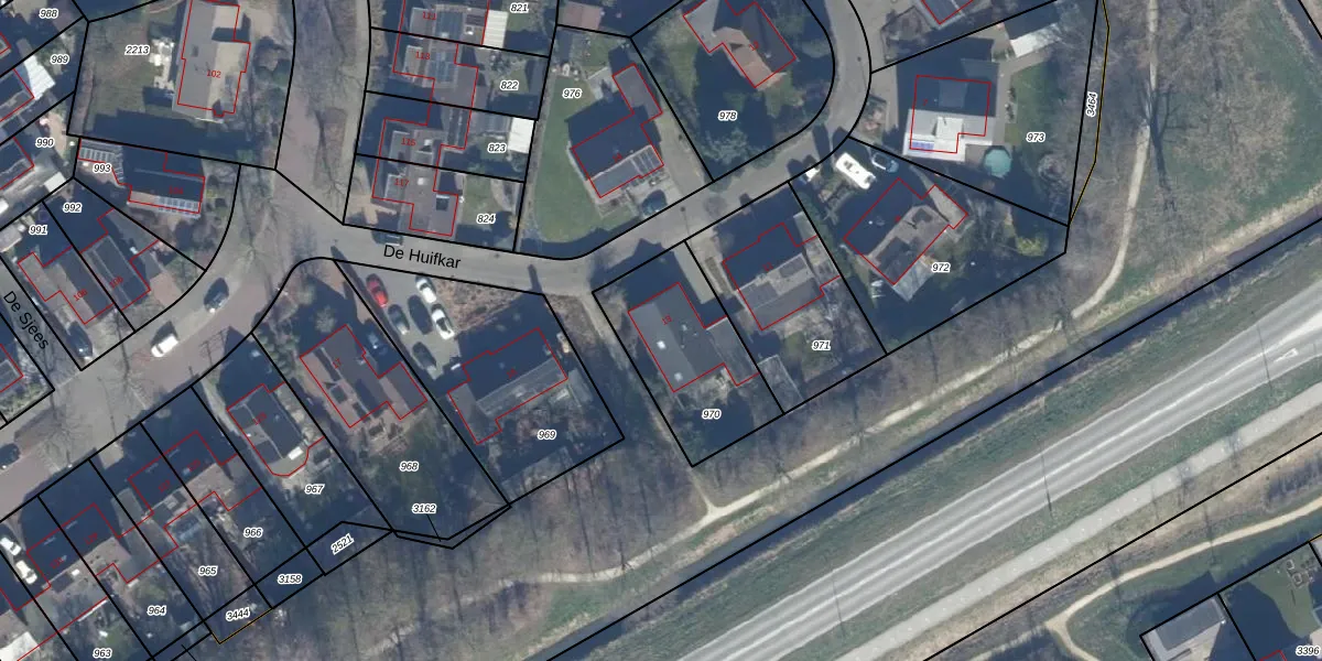 Het perceel waarop De Huifkar 13 staat heeft een oppervlakte van 485 m². Dit is een groot perceel. De perceeloppervlakte wordt geregistreerd door het Kadaster. Gedetailleerde informatie over de maten van dit perceel kunt u vinden in het rapport Kadastrale kaart met maatvoering van De Huifkar 13.