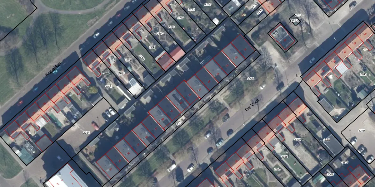 De Voor 45 is gelegen op kadastraal perceel DTN01E3104. Deze kadastrale aanduiding is uniek en wordt gebruikt door het Kadaster om eigendomsrechten en andere zakelijke rechten vast te leggen. Het perceel maakt onderdeel uit van de kadastrale gemeente Dronten.