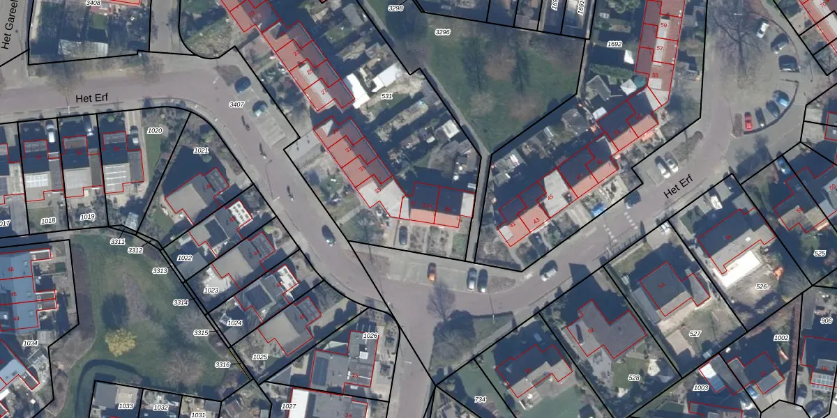 Het perceel waarop Het Erf 37-A staat heeft een oppervlakte van 2704 m². Dit is een zeer groot perceel. De perceeloppervlakte wordt geregistreerd door het Kadaster. Gedetailleerde informatie over de maten van dit perceel kunt u vinden in het rapport Kadastrale kaart met maatvoering van Het Erf 37-A.