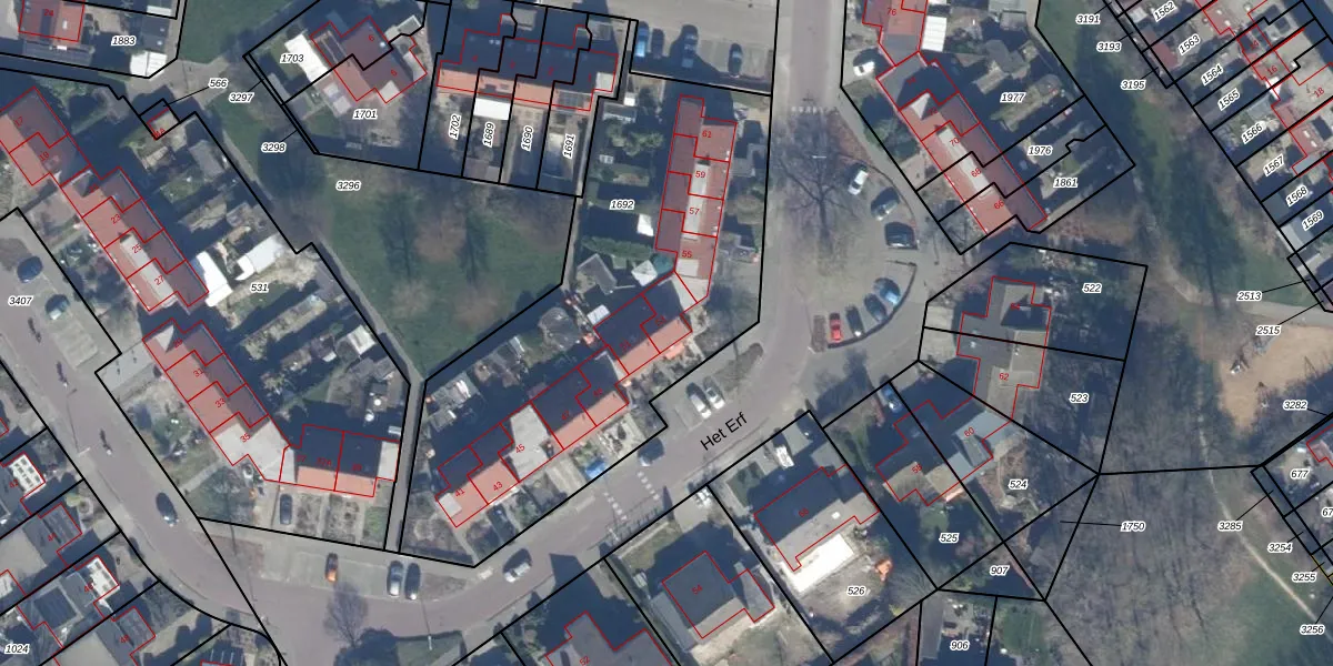 Het perceel waarop Het Erf 53 staat heeft een oppervlakte van 2108 m². Dit is een zeer groot perceel. De perceeloppervlakte wordt geregistreerd door het Kadaster. Gedetailleerde informatie over de maten van dit perceel kunt u vinden in het rapport Kadastrale kaart met maatvoering van Het Erf 53.
