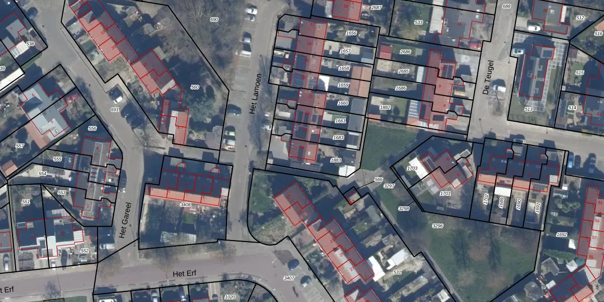 Het perceel waarop Het Lamoen 24 staat heeft een oppervlakte van 303 m². Dit is een groot perceel. De perceeloppervlakte wordt geregistreerd door het Kadaster. Gedetailleerde informatie over de maten van dit perceel kunt u vinden in het rapport Kadastrale kaart met maatvoering van Het Lamoen 24.