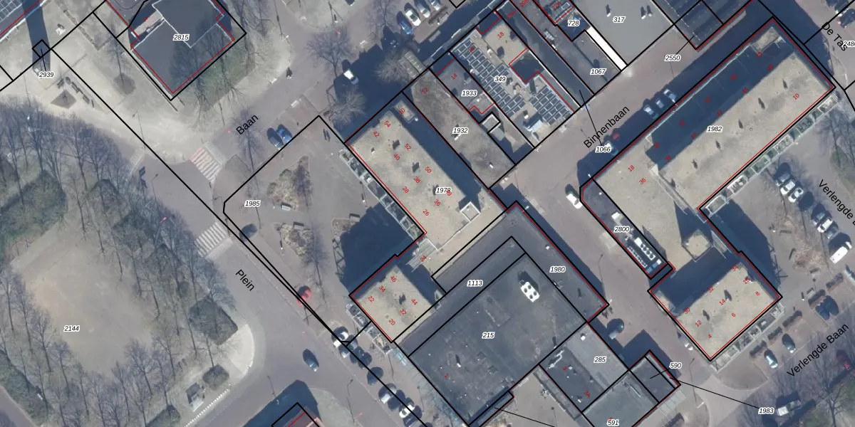 Het perceel waarop Plein 26 staat heeft een oppervlakte van 976 m². Dit is een groot perceel. De perceeloppervlakte wordt geregistreerd door het Kadaster. Gedetailleerde informatie over de maten van dit perceel kunt u vinden in het rapport Kadastrale kaart met maatvoering van Plein 26.