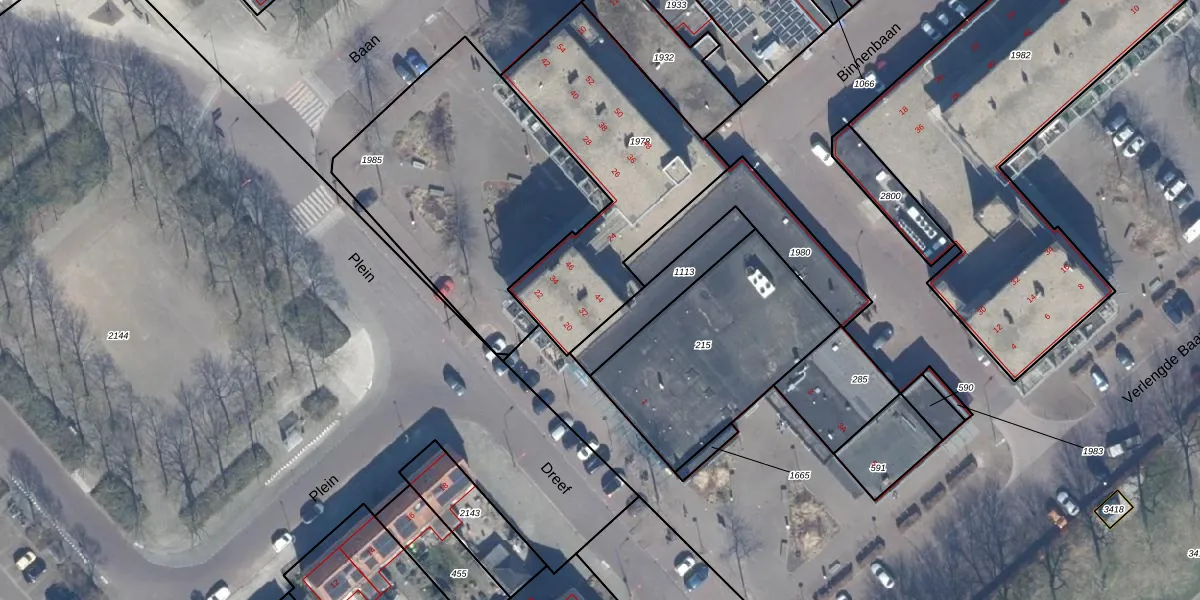 Het perceel waarop Plein 32 staat heeft een oppervlakte van 976 m². Dit is een groot perceel. De perceeloppervlakte wordt geregistreerd door het Kadaster. Gedetailleerde informatie over de maten van dit perceel kunt u vinden in het rapport Kadastrale kaart met maatvoering van Plein 32.