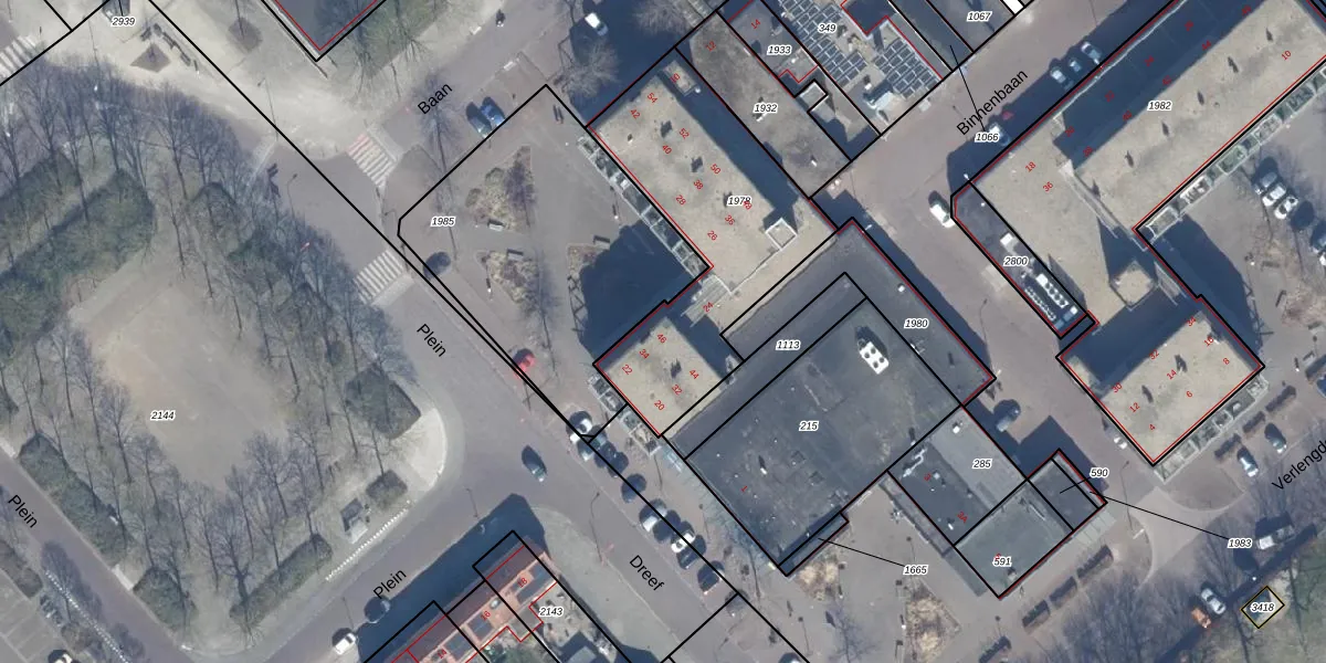 Het perceel waarop Plein 34 staat heeft een oppervlakte van 976 m². Dit is een groot perceel. De perceeloppervlakte wordt geregistreerd door het Kadaster. Gedetailleerde informatie over de maten van dit perceel kunt u vinden in het rapport Kadastrale kaart met maatvoering van Plein 34.