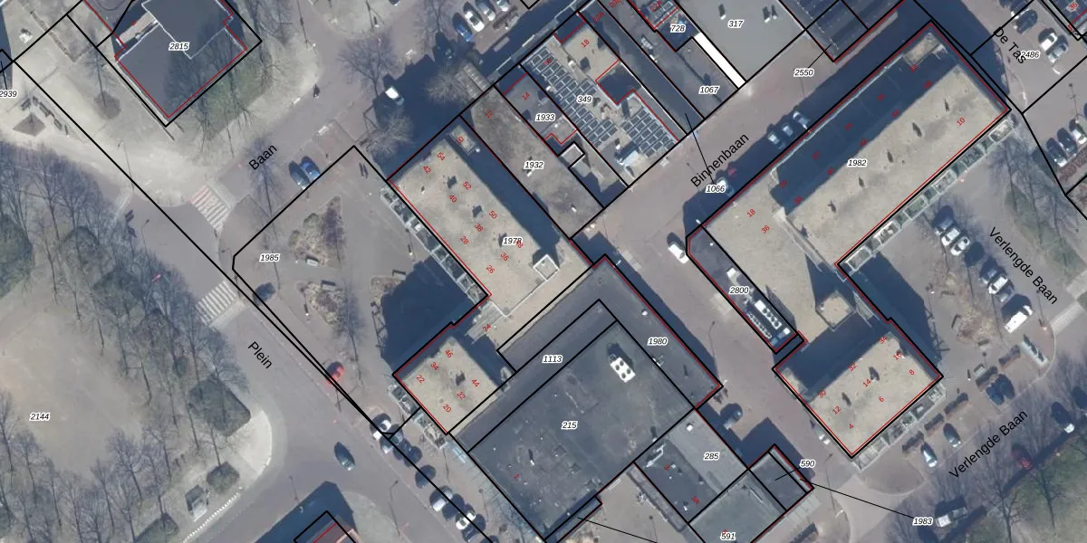 Het perceel waarop Plein 38 staat heeft een oppervlakte van 976 m². Dit is een groot perceel. De perceeloppervlakte wordt geregistreerd door het Kadaster. Gedetailleerde informatie over de maten van dit perceel kunt u vinden in het rapport Kadastrale kaart met maatvoering van Plein 38.