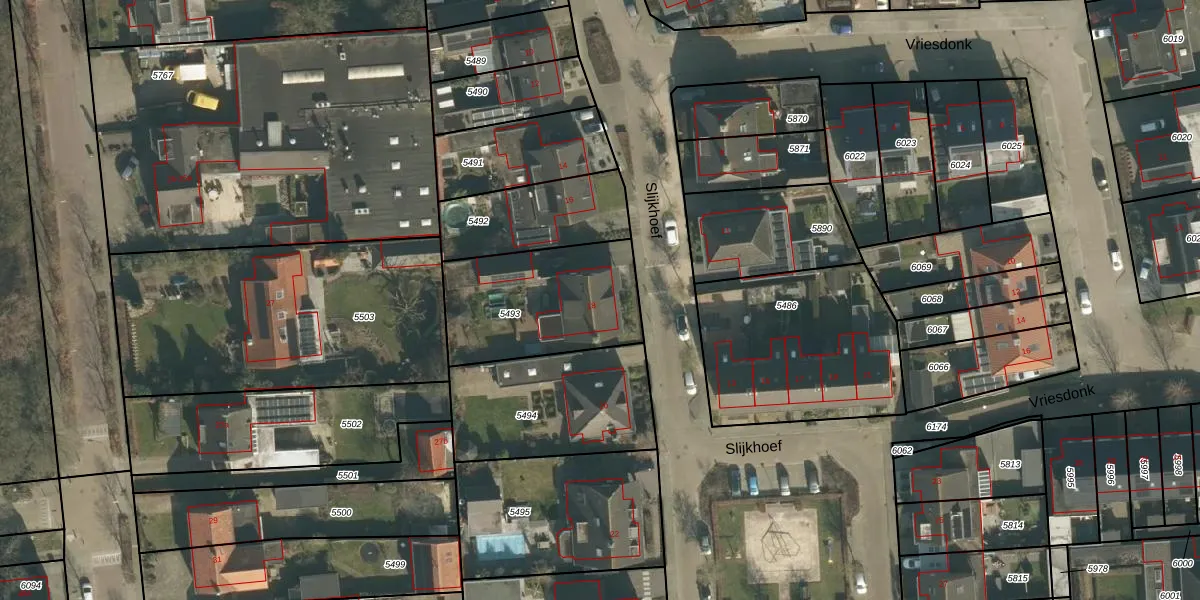 Het perceel waarop Slijkhoef 18 staat heeft een oppervlakte van 565 m². Dit is een groot perceel. De perceeloppervlakte wordt geregistreerd door het Kadaster. Gedetailleerde informatie over de maten van dit perceel kunt u vinden in het rapport Kadastrale kaart met maatvoering van Slijkhoef 18.