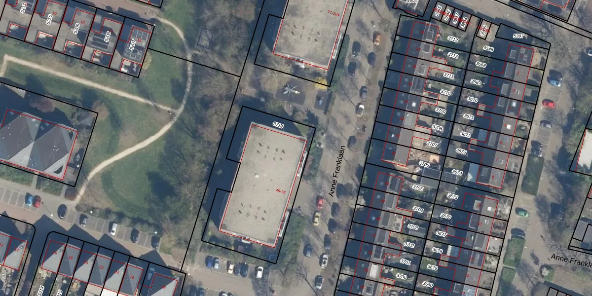 Het perceel waarop Anne Franklaan 55 staat heeft een oppervlakte van 1198 m². Dit is een zeer groot perceel. De perceeloppervlakte wordt geregistreerd door het Kadaster. Gedetailleerde informatie over de maten van dit perceel kunt u vinden in het rapport Kadastrale kaart met maatvoering van Anne Franklaan 55.