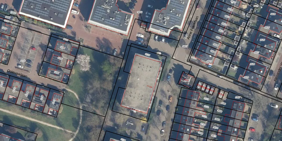 Het perceel waarop Anne Franklaan 96 staat heeft een oppervlakte van 1197 m². Dit is een zeer groot perceel. De perceeloppervlakte wordt geregistreerd door het Kadaster. Gedetailleerde informatie over de maten van dit perceel kunt u vinden in het rapport Kadastrale kaart met maatvoering van Anne Franklaan 96.