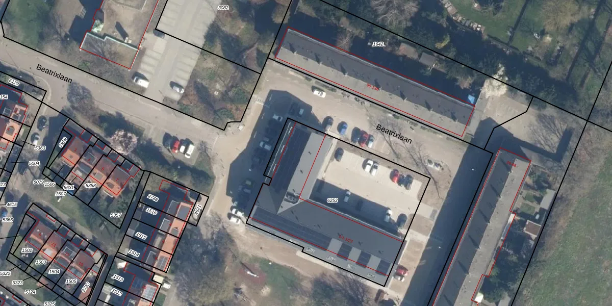 Het perceel waarop Beatrixlaan 1-8 staat heeft een oppervlakte van 1892 m². Dit is een zeer groot perceel. De perceeloppervlakte wordt geregistreerd door het Kadaster. Gedetailleerde informatie over de maten van dit perceel kunt u vinden in het rapport Kadastrale kaart met maatvoering van Beatrixlaan 1-8.