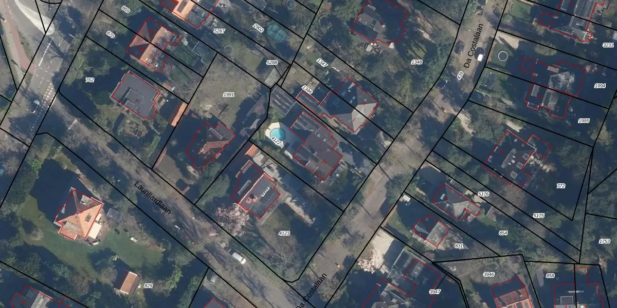 Het perceel waarop Da Costalaan 1-A staat heeft een oppervlakte van 755 m². Dit is een groot perceel. De perceeloppervlakte wordt geregistreerd door het Kadaster. Gedetailleerde informatie over de maten van dit perceel kunt u vinden in het rapport Kadastrale kaart met maatvoering van Da Costalaan 1-A.
