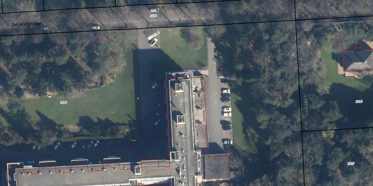 Het perceel waarop De Hooghlaan 2-GB5 staat heeft een oppervlakte van 2,7 ha. Dit is een zeer groot perceel. De perceeloppervlakte wordt geregistreerd door het Kadaster. Gedetailleerde informatie over de maten van dit perceel kunt u vinden in het rapport Kadastrale kaart met maatvoering van De Hooghlaan 2-GB5.