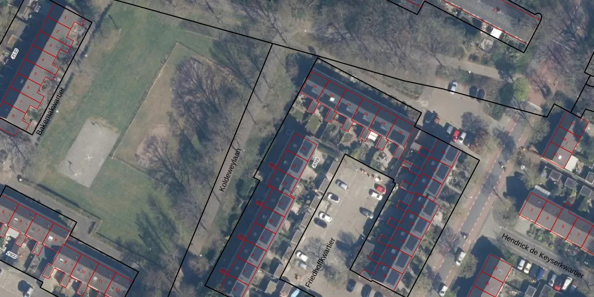 Het perceel waarop Friedhoffkwartier 14 staat heeft een oppervlakte van 4265 m². Dit is een zeer groot perceel. De perceeloppervlakte wordt geregistreerd door het Kadaster. Gedetailleerde informatie over de maten van dit perceel kunt u vinden in het rapport Kadastrale kaart met maatvoering van Friedhoffkwartier 14.