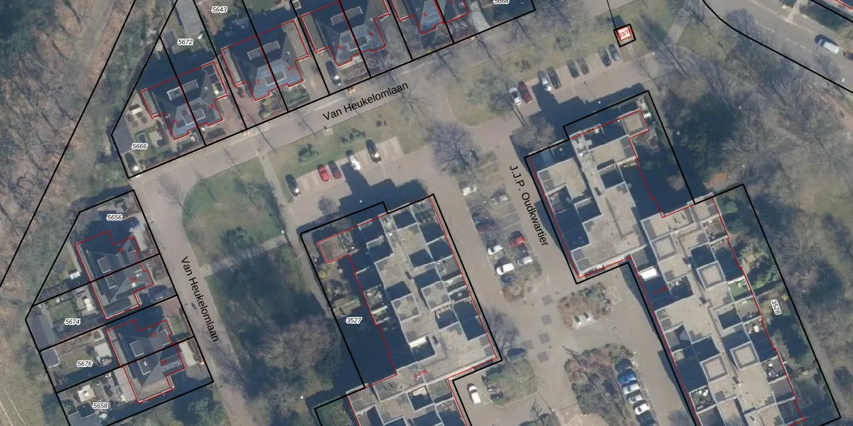 Het perceel waarop J.J.P. Oudkwartier 1-GB54 staat heeft een oppervlakte van 2855 m². Dit is een zeer groot perceel. De perceeloppervlakte wordt geregistreerd door het Kadaster. Gedetailleerde informatie over de maten van dit perceel kunt u vinden in het rapport Kadastrale kaart met maatvoering van J.J.P. Oudkwartier 1-GB54.
