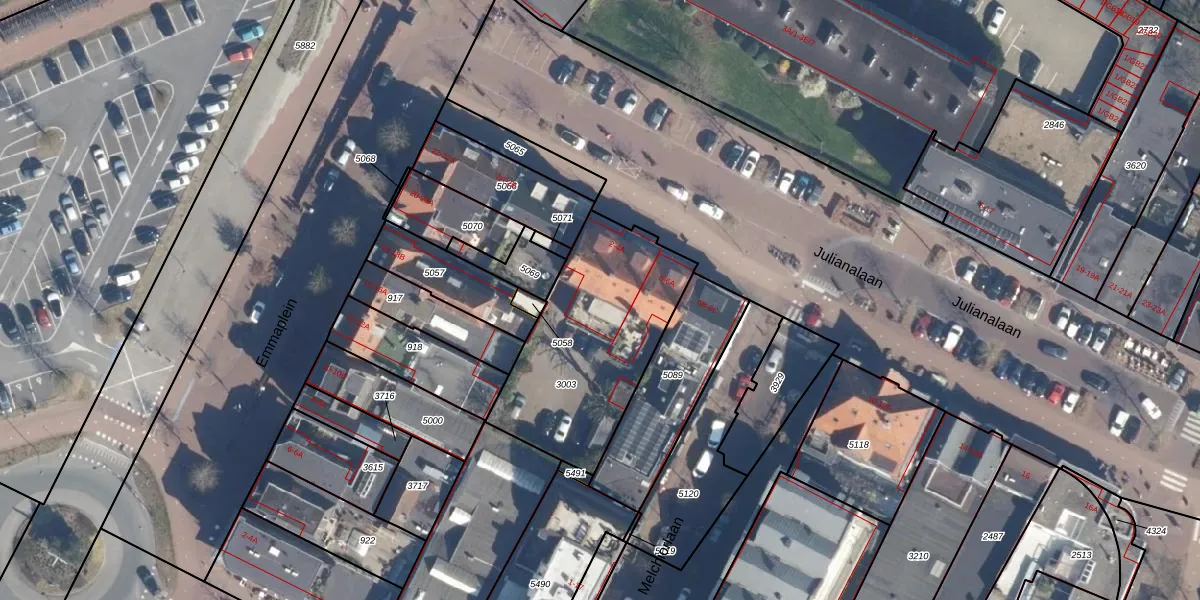 Het perceel waarop Julianalaan 4-A staat heeft een oppervlakte van 805 m². Dit is een groot perceel. De perceeloppervlakte wordt geregistreerd door het Kadaster. Gedetailleerde informatie over de maten van dit perceel kunt u vinden in het rapport Kadastrale kaart met maatvoering van Julianalaan 4-A.