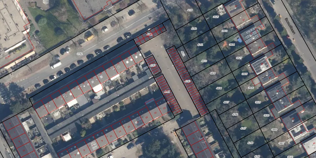Het adres is gelegen op perceel 4144 in de sectie E en de kadastrale gemeente De Bilt. De kadastrale aanduiding is aldus BIL01-E-4144. Het perceel is 160 m² groot. Dat is kleiner dan de gemiddelde perceeloppervlakte in De Bilt, dat op 2129,35 m² ligt. Het kleinste perceel in de kadastrale gemeente is 0 m² groot. De grootste perceeloppervlakte is 77,4 ha. Op het perceel zijn 9 adressen aanwezig. In de Basisregistratie Kadaster (BRK) werden de grenzen van het perceel geregistreerd op 19-09-1997.