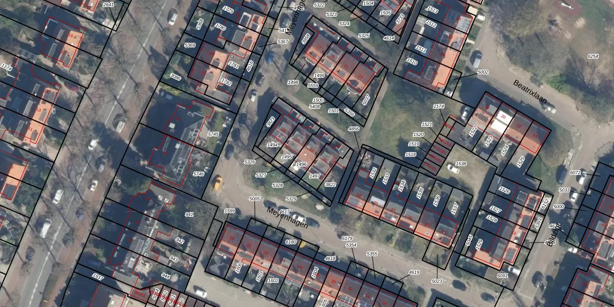 Het perceel waarop Meyenhagen 29 staat heeft een oppervlakte van 95 m². Dit is een klein perceel. De perceeloppervlakte wordt geregistreerd door het Kadaster. Gedetailleerde informatie over de maten van dit perceel kunt u vinden in het rapport Kadastrale kaart met maatvoering van Meyenhagen 29.