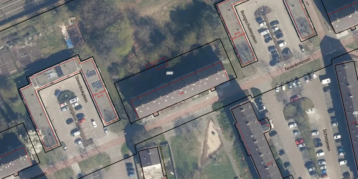 Het perceel waarop Noorderkroon 40 staat heeft een oppervlakte van 1557 m². Dit is een zeer groot perceel. De perceeloppervlakte wordt geregistreerd door het Kadaster. Gedetailleerde informatie over de maten van dit perceel kunt u vinden in het rapport Kadastrale kaart met maatvoering van Noorderkroon 40.