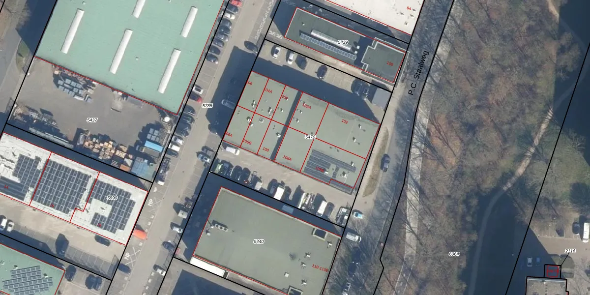 Het perceel waarop P.C. Staalweg 108-A staat heeft een oppervlakte van 2360 m². Dit is een zeer groot perceel. De perceeloppervlakte wordt geregistreerd door het Kadaster. Gedetailleerde informatie over de maten van dit perceel kunt u vinden in het rapport Kadastrale kaart met maatvoering van P.C. Staalweg 108-A.