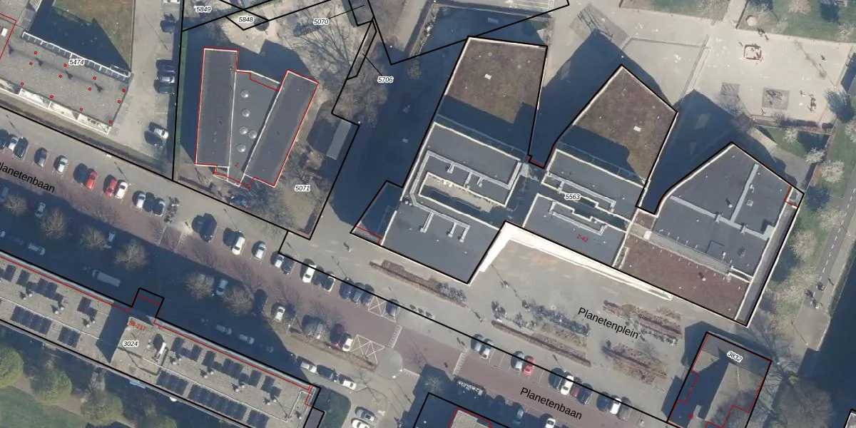 Het perceel waarop Planetenplein 14 staat heeft een oppervlakte van 3425 m². Dit is een zeer groot perceel. De perceeloppervlakte wordt geregistreerd door het Kadaster. Gedetailleerde informatie over de maten van dit perceel kunt u vinden in het rapport Kadastrale kaart met maatvoering van Planetenplein 14.