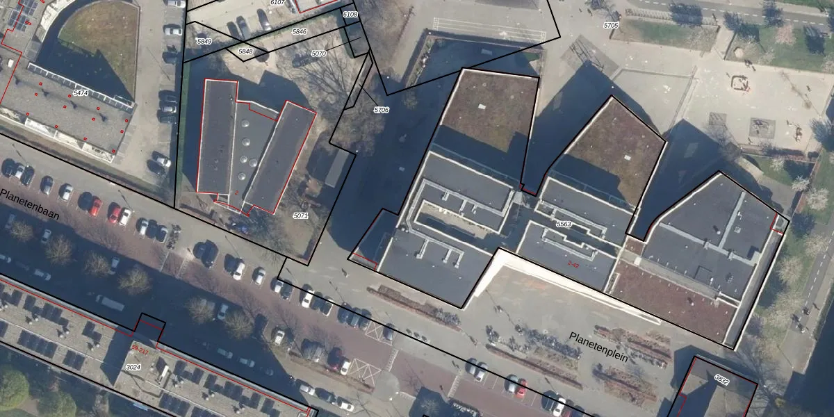 Het perceel waarop Planetenplein 24 staat heeft een oppervlakte van 3425 m². Dit is een zeer groot perceel. De perceeloppervlakte wordt geregistreerd door het Kadaster. Gedetailleerde informatie over de maten van dit perceel kunt u vinden in het rapport Kadastrale kaart met maatvoering van Planetenplein 24.