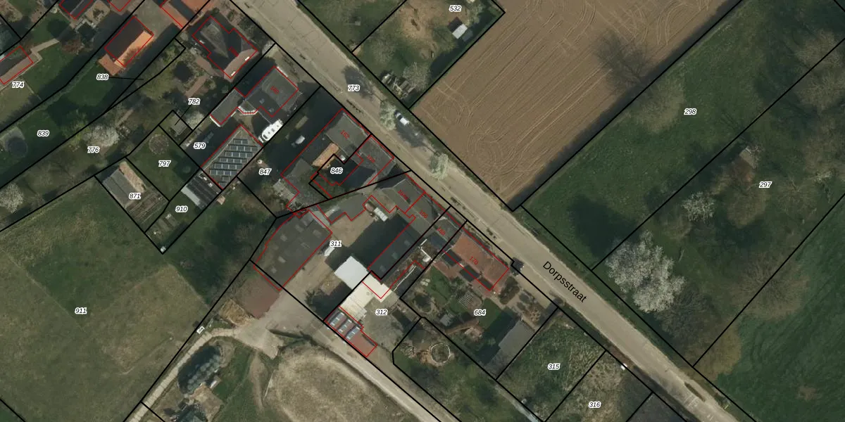 Het perceel waarop Dorpsstraat 166 staat heeft een oppervlakte van 820 m². Dit is een groot perceel. De perceeloppervlakte wordt geregistreerd door het Kadaster. Gedetailleerde informatie over de maten van dit perceel kunt u vinden in het rapport Kadastrale kaart met maatvoering van Dorpsstraat 166.