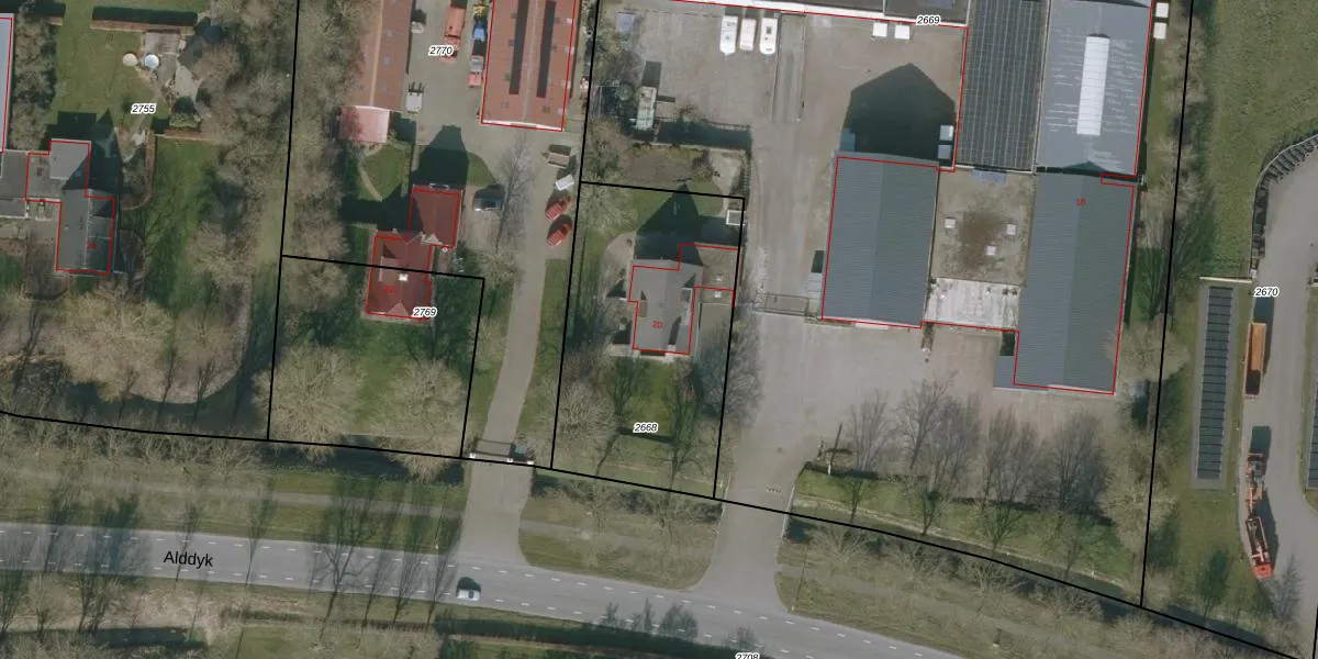 Het perceel waarop Alddyk 20 staat heeft een oppervlakte van 1121 m². Dit is een zeer groot perceel. De perceeloppervlakte wordt geregistreerd door het Kadaster. Gedetailleerde informatie over de maten van dit perceel kunt u vinden in het rapport Kadastrale kaart met maatvoering van Alddyk 20.