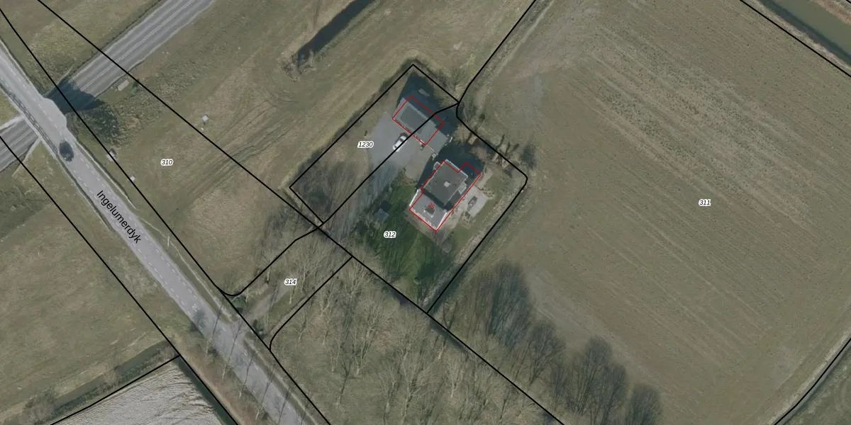 Het perceel waarop Ingelumerdyk 35 staat heeft een oppervlakte van 1250 m². Dit is een zeer groot perceel. De perceeloppervlakte wordt geregistreerd door het Kadaster. Gedetailleerde informatie over de maten van dit perceel kunt u vinden in het rapport Kadastrale kaart met maatvoering van Ingelumerdyk 35.