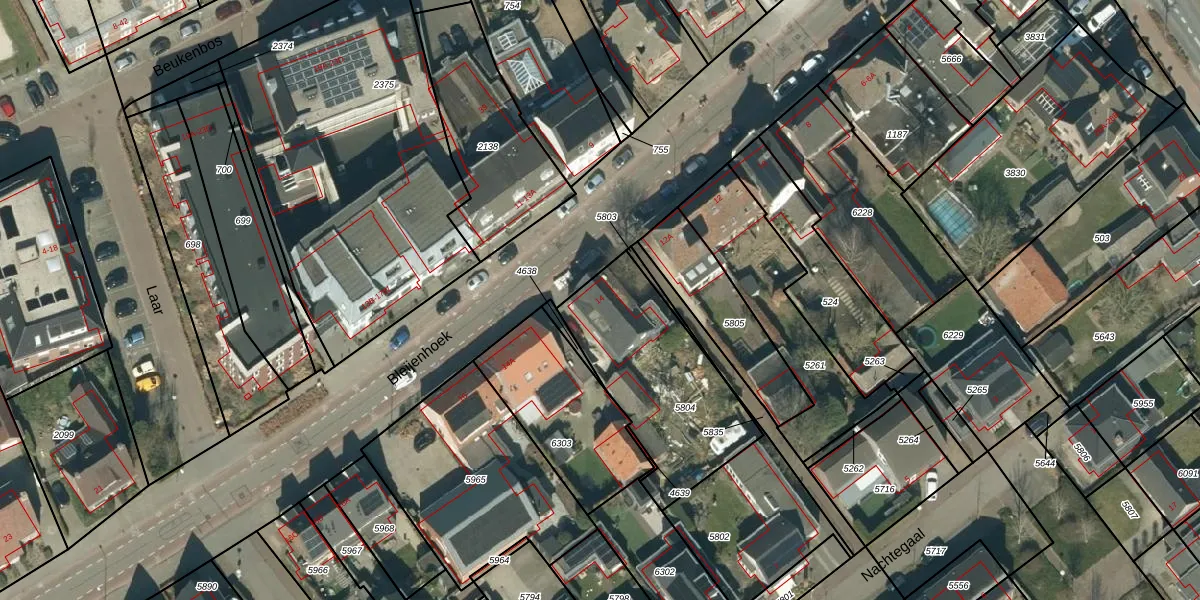 Het perceel waarop Bleijenhoek 14 staat heeft een oppervlakte van 655 m². Dit is een groot perceel. De perceeloppervlakte wordt geregistreerd door het Kadaster. Gedetailleerde informatie over de maten van dit perceel kunt u vinden in het rapport Kadastrale kaart met maatvoering van Bleijenhoek 14.